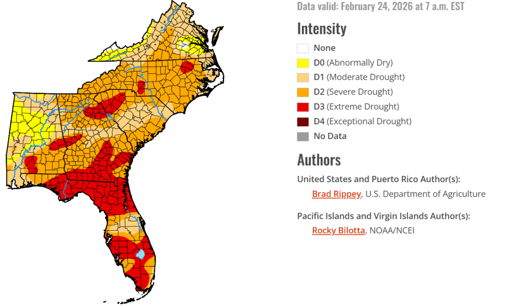 The map below was released on Feb 24, showing the severity – from Virginia to Florida and Alabama, almost all of the Southeast is classified as being in, at minimum, severe drought.